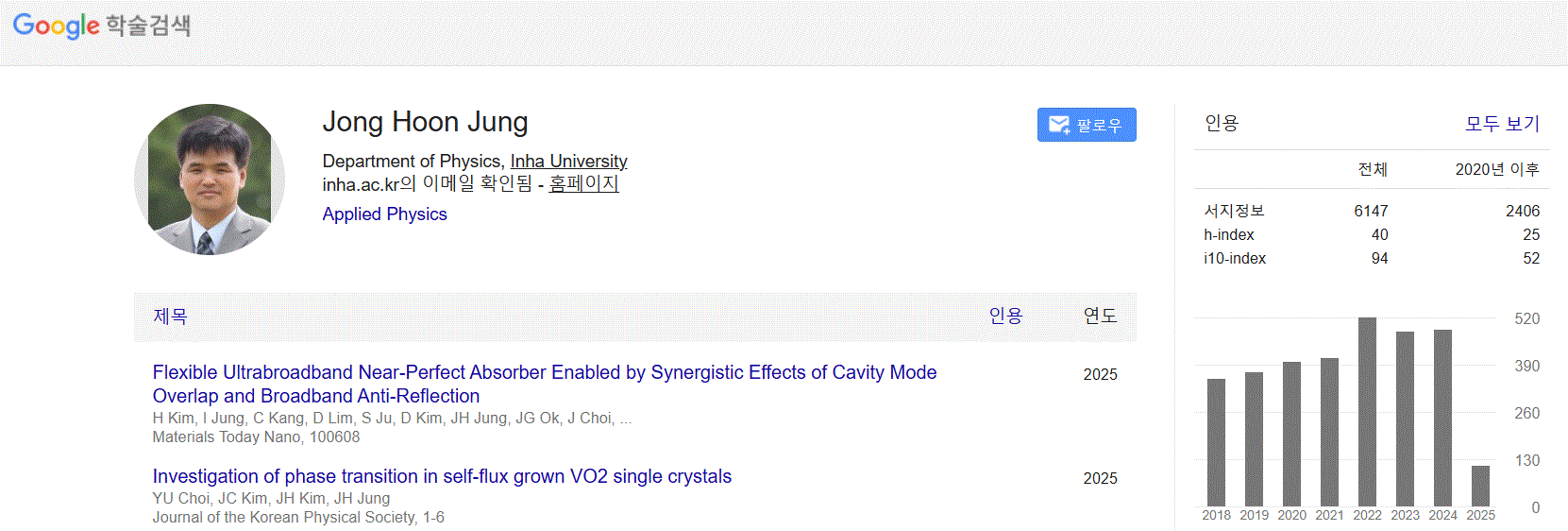 정종훈 교수, h-index 40 도달 (Google Scholar) (25. 03. 19)